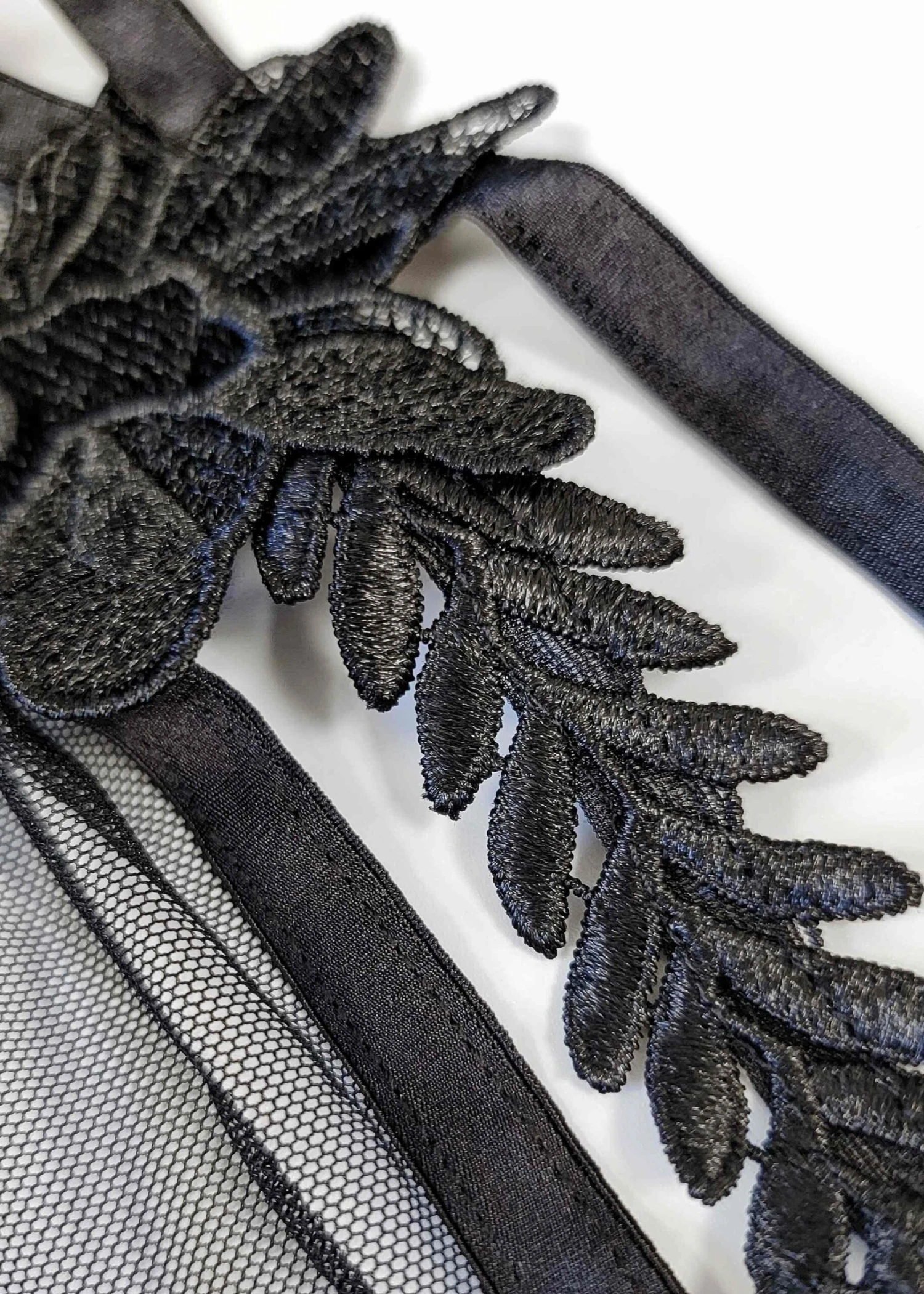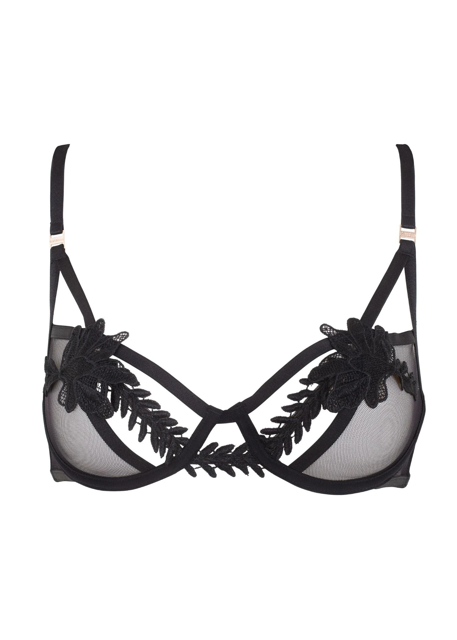 - Sheer mesh cups with cut-outs