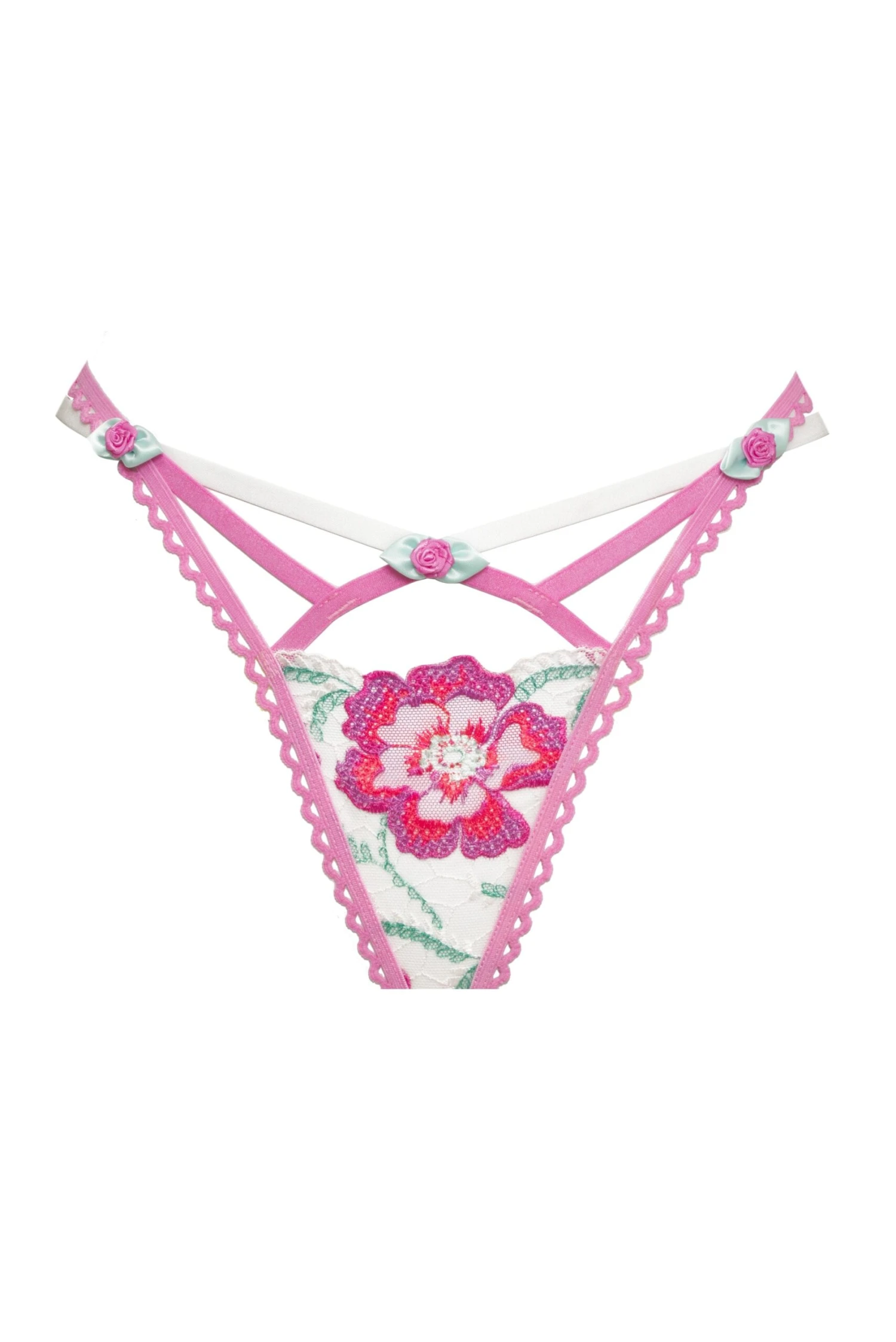 Floral embroidery brightens up this little G-string panty. Mini rosettes and strappy details accent the style.