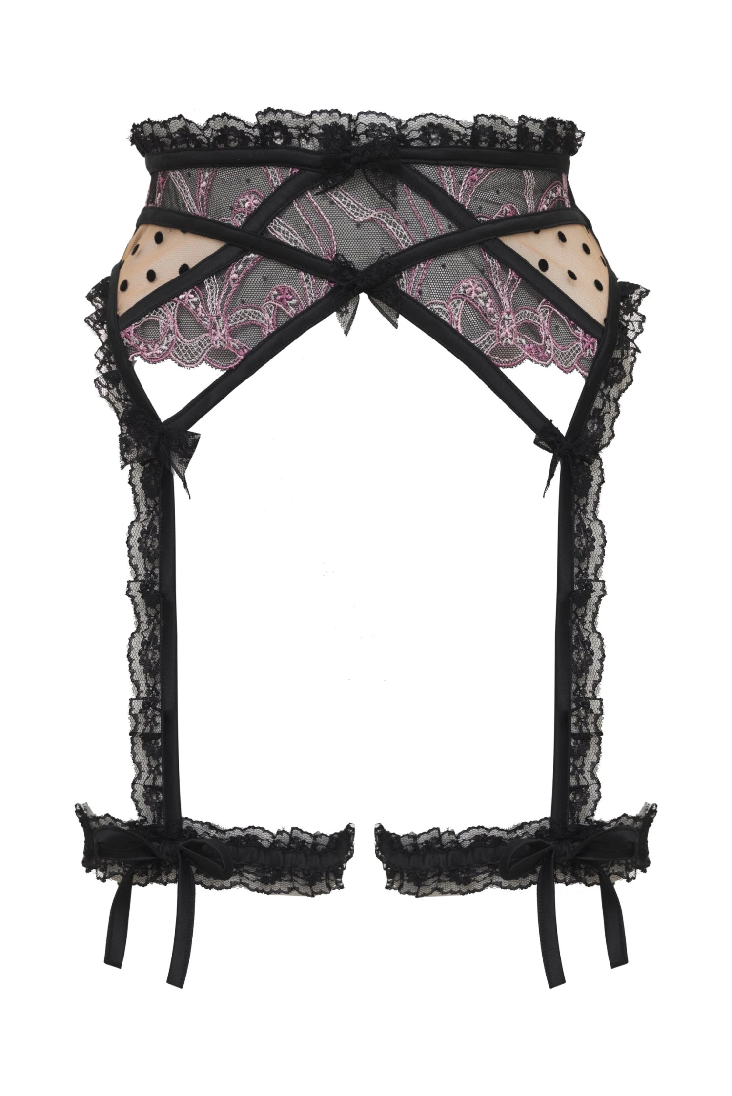 This decadent piece is the stuff baroque fantasies are made of. Featuring pink bow embroidery plus black doily lace and dotted mesh for a vampy contrast. Garter straps invite your sultriest stockings.
