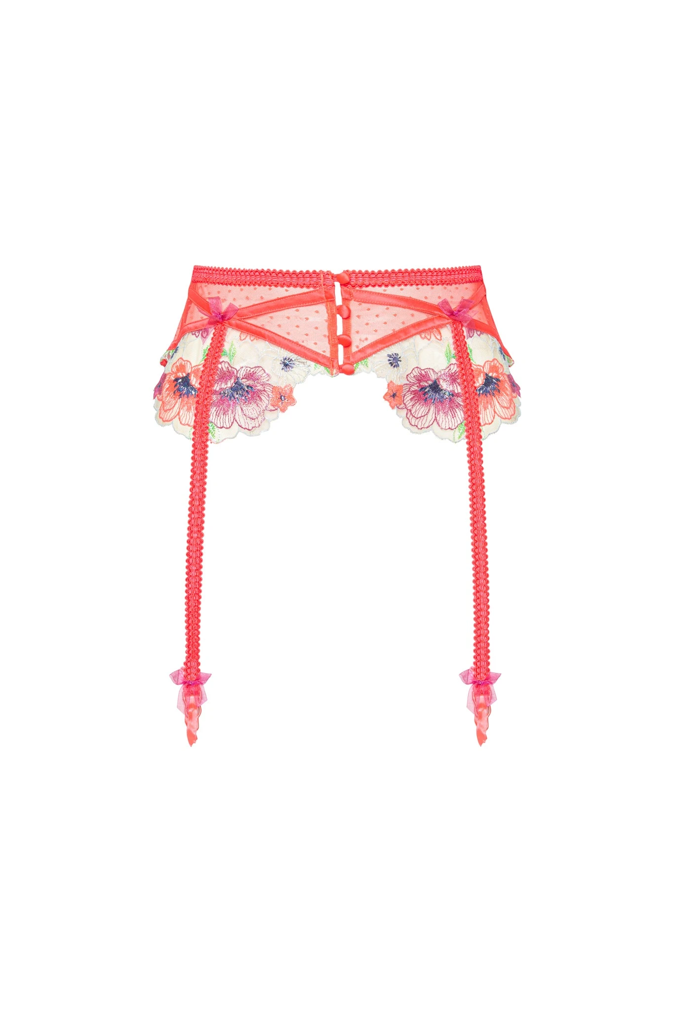 This statement-making garter belt combines delicate floral embroidery with shocking pink trim and panels of dotted mesh. Perfect paired with the matching bra and panty.