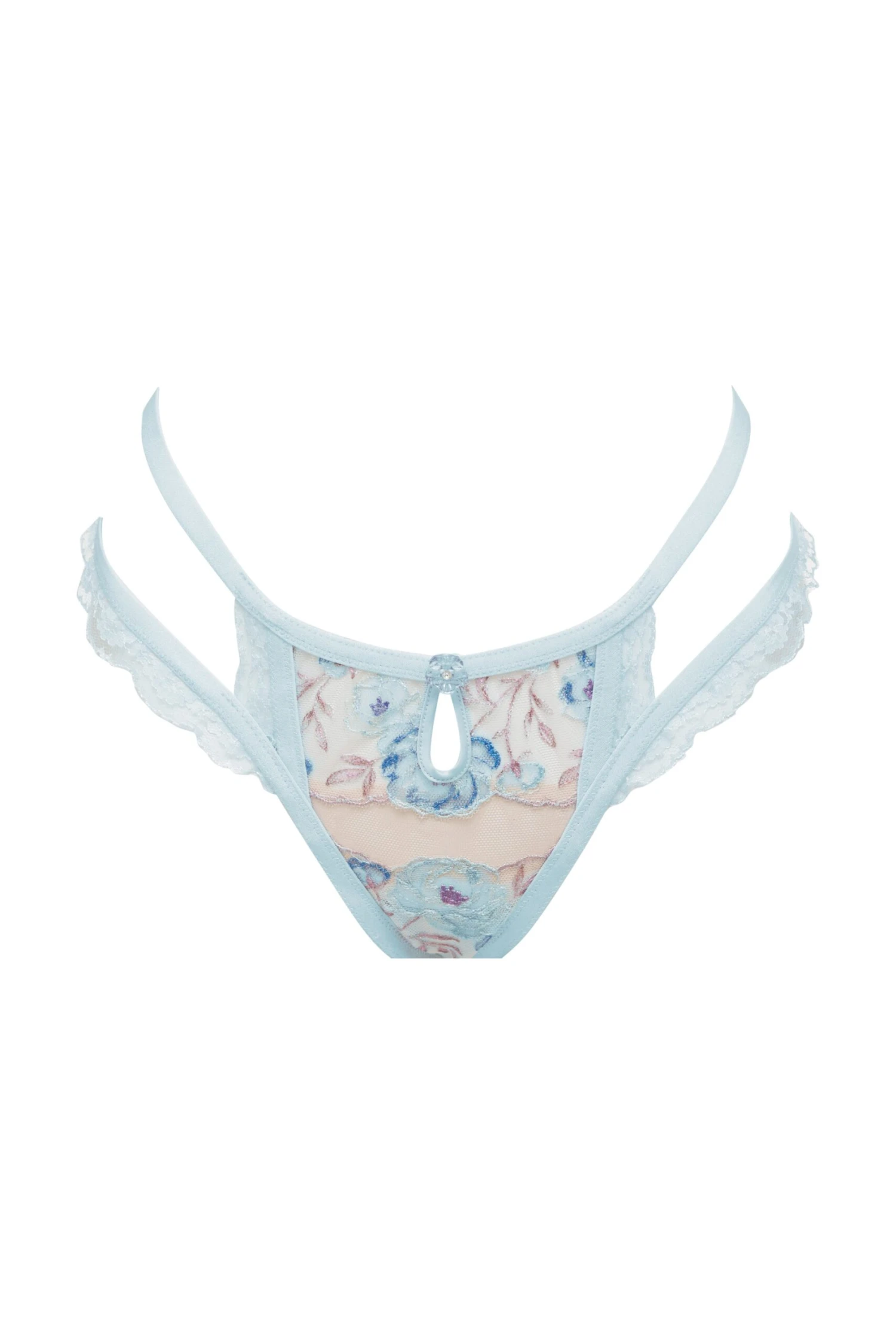 A study in gorgeous watercolors and floral embroidery—this ultra romantic thong features strappy accents, peekaboo cutouts, and doily lace details throughout. Finished with crystal flower buttons for extra charm.